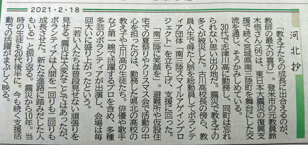 今月、震災からちょうど10年を迎えますが、こうした時期に、地元紙・河北新報に、これまでの活動が取り上げられましたので紹介いたします。