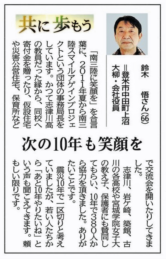 今月、震災からちょうど10年を迎えますが、こうした時期に、地元紙・河北新報に、これまでの活動が取り上げられましたので紹介いたします。