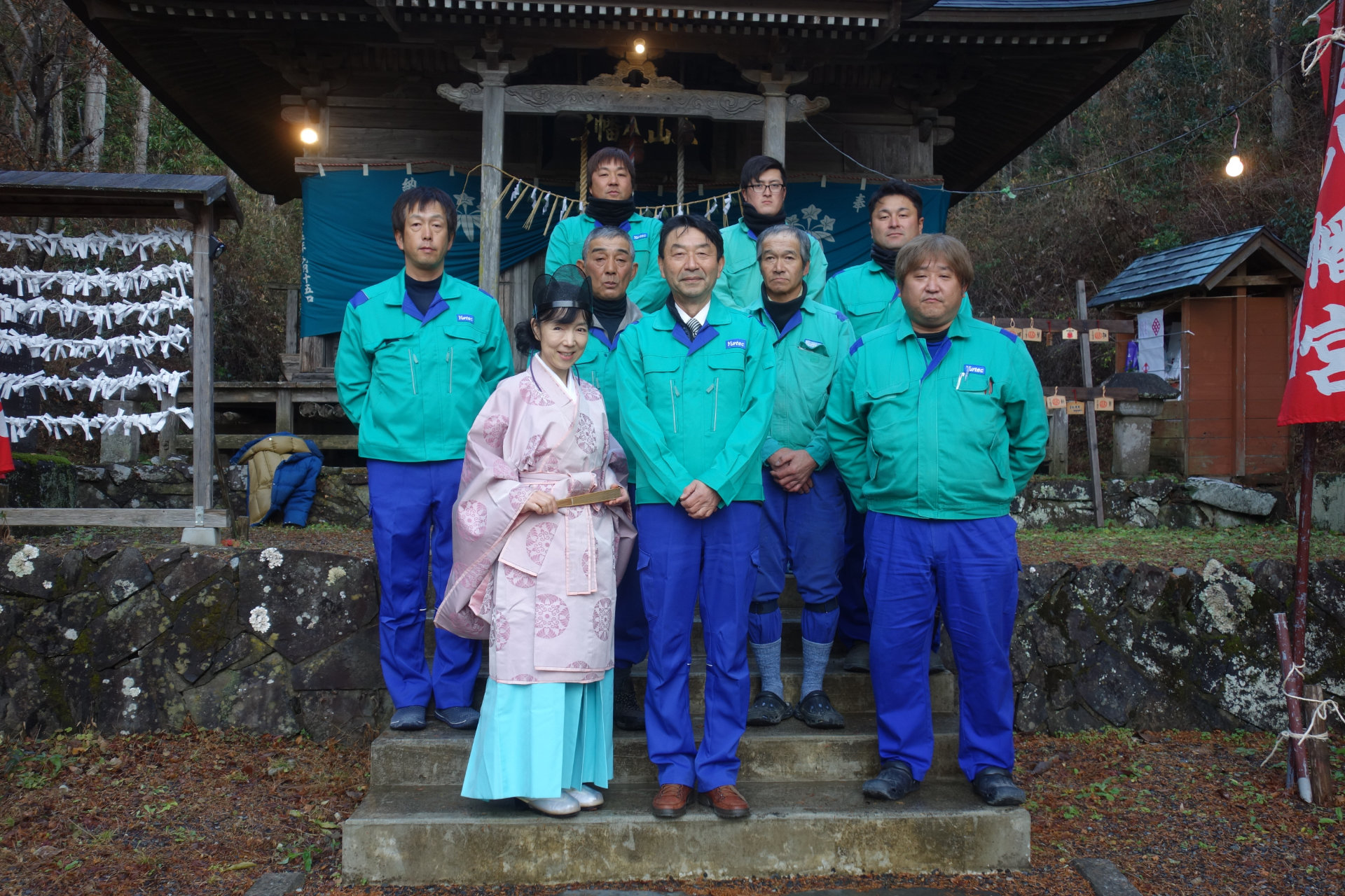 その後、南三陸町の上山八幡宮で安全祈願をしました。禰宜の工藤真弓さんから、「年頭の挨拶」をいただき、一同感激しました。帰り際、境内にある梅に一輪二輪。今年は春から縁起が良いですね。